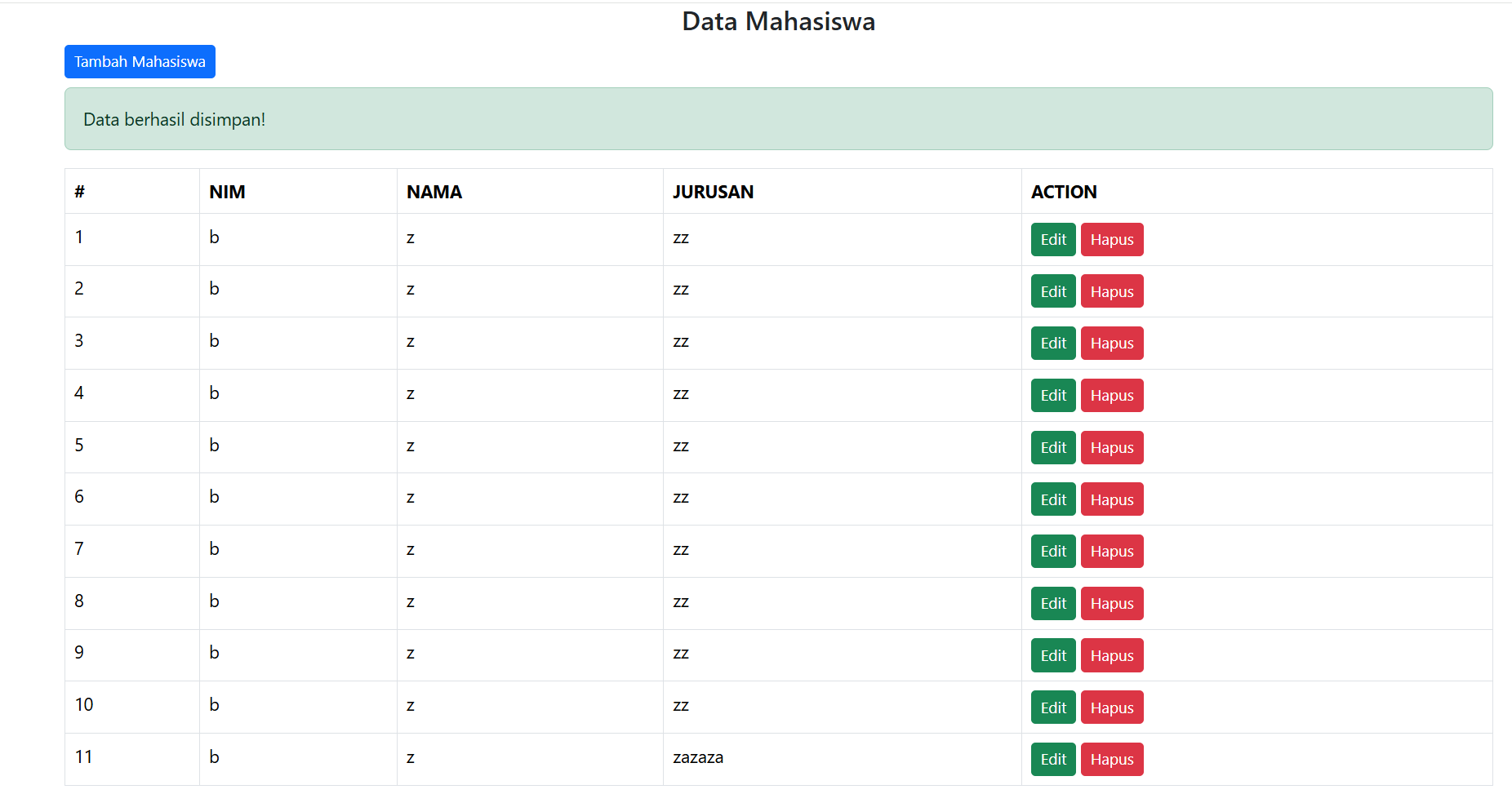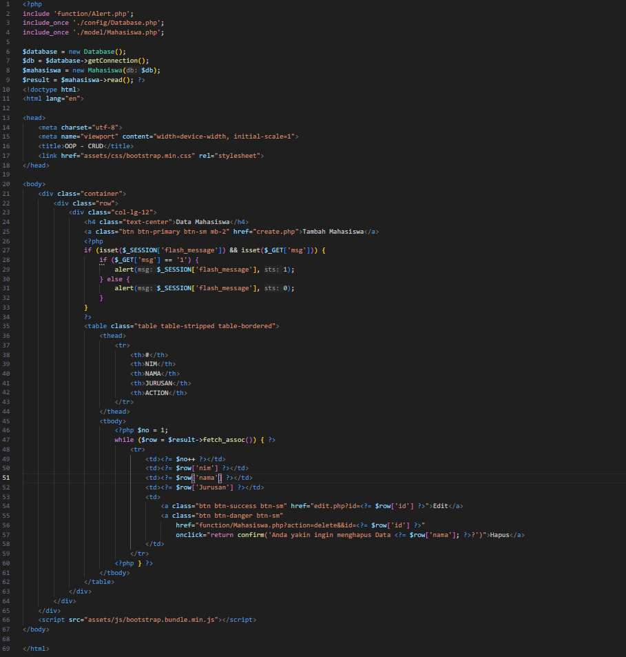 9.Selanjutnya kita akan pindah ke index.php yang berisi tampilan data-data mahasiswa yag telah berhasil diinputkan kedalam database.untuk isi dari index.html seperti gambar di bawah.