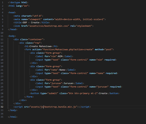 10.Setelah itu akan pindah ke Create.php. File ini berisi form inputan untuk memambahkan data mahasiswa.untuk isi dari create.php seperti gambar di bawah.