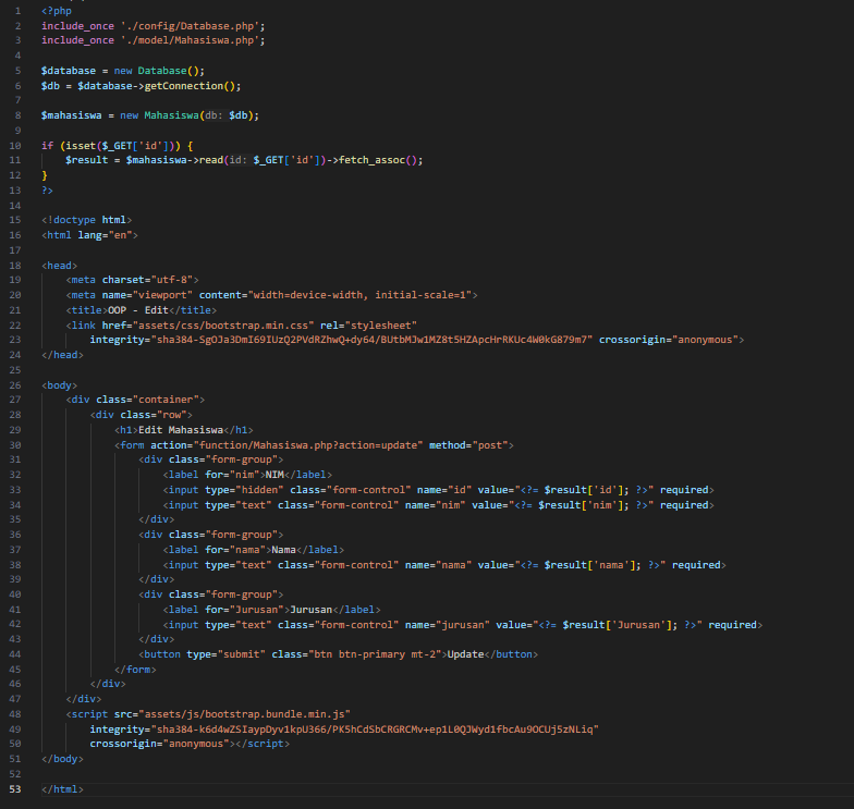 11.Terakhir kita akan pindah ke edit.php. File ini berisi form untuk melakukan perubahan data mahasiswa..untuk isi dari edit.php seperti gambar di bawah.