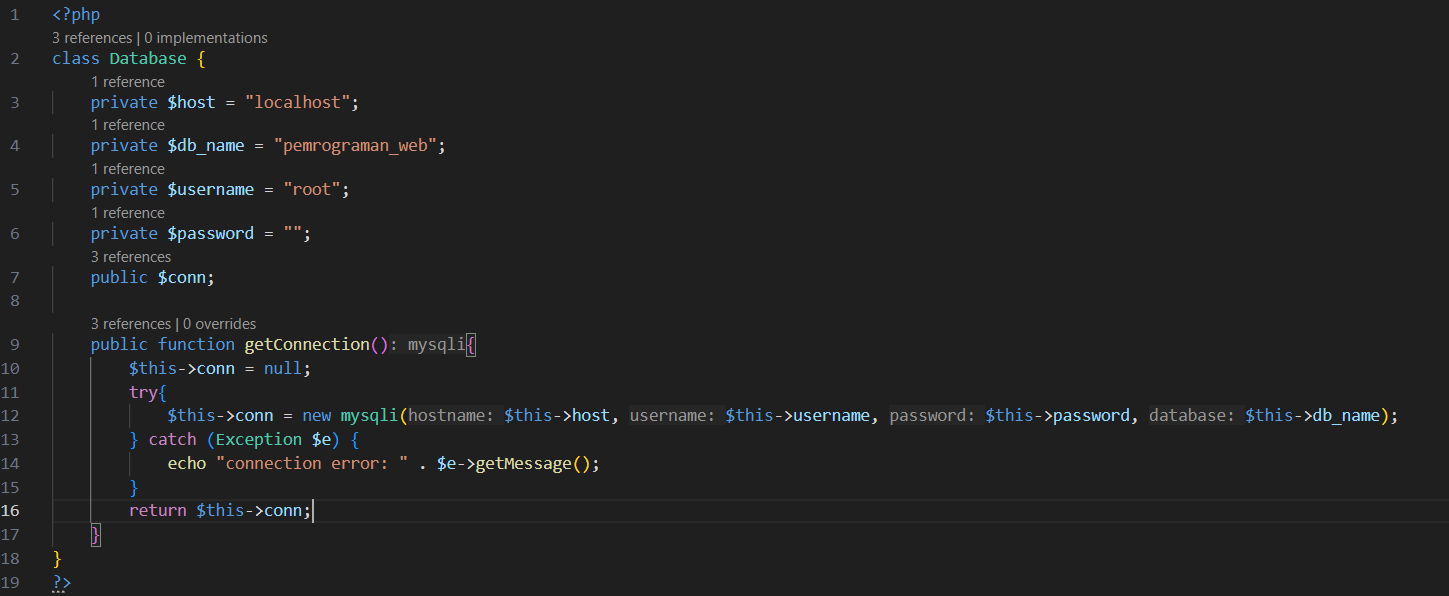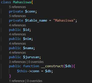 B.buat class mahasiswa dan tambahkan variabel variabel yang akan dibutuhkan dan tambahkan constructor untuk koneksi DB. Seperti gambar di bawah.