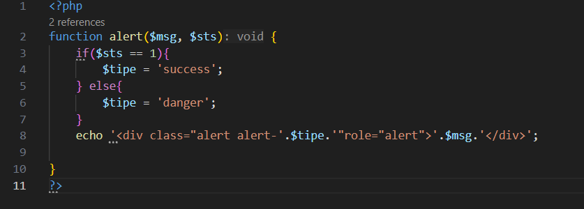 6.Setelah itu kita akan pindah ke folder function pada file Alert.php. File Alert digunakan untuk membuat sebuah function yang berfungsi untuk menampilkan pesan Ketika melakukan operasi terhadap data, fungsi ini memiliki 2 buah argument statement yaitu $msg yang berisi pesan dan $sts yang berisi kode jika status 1 maka pesan berhasil dan jika 0 maka pesan gagal.Untuk isi file seperti gambar dibawah.
